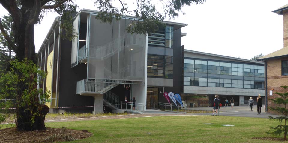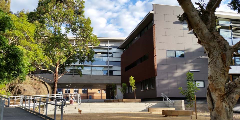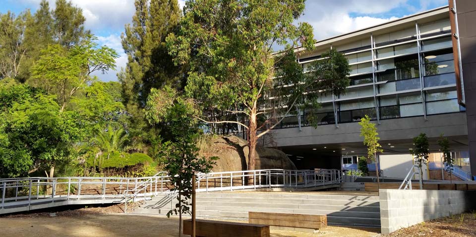 The building is sited to celebrate a natural sandstone outcrop and to create a new courtyard in front of the heritage listed classroom block.